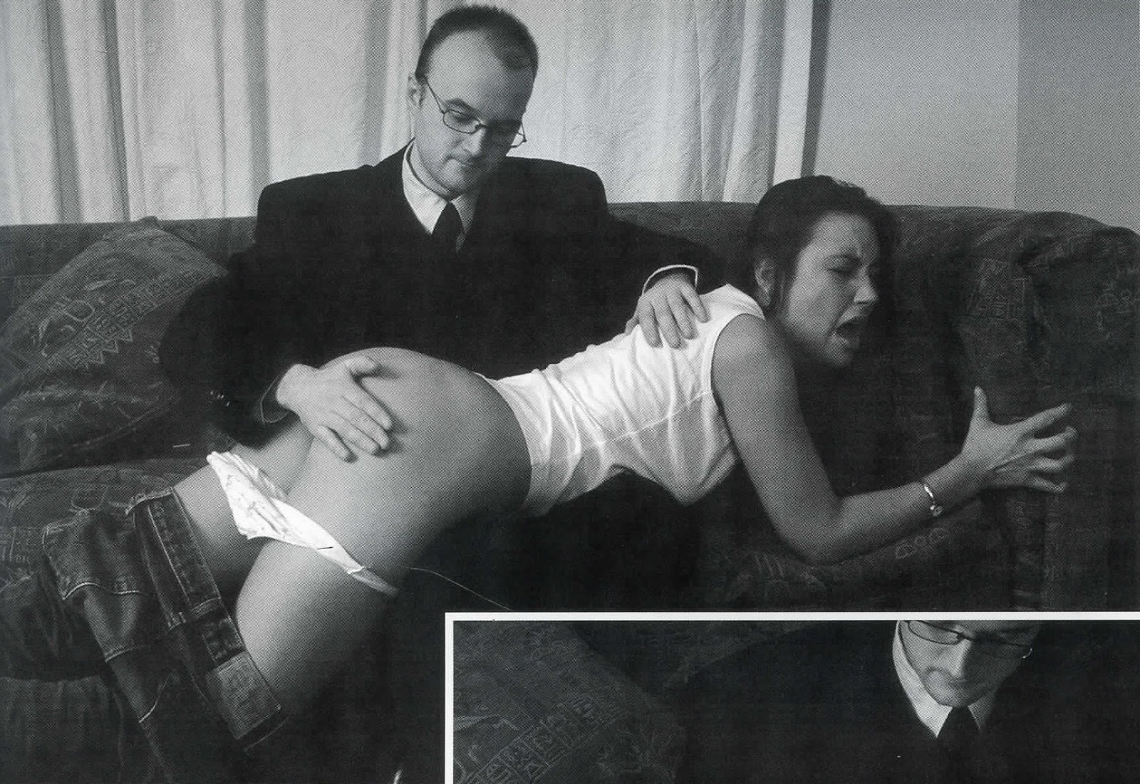 Her bottom is becoming so hot that she fancies it is starting to swell and that it will soon burst the seams of her trousers. So when Mr Bowers tells her to help him pull them down, she wonders whether she voiced the thought aloud, or whether this is a standard part of the proceedings (her employer seems to have too good an idea of accepted procedure for this to be a one off, she realises). With her jeans now inelegantly rumpled around her calves, the spanking resumes. Her knickers offer little protection and soon become an irritating detail for her chastiser, so they too are dragged down her thighs.