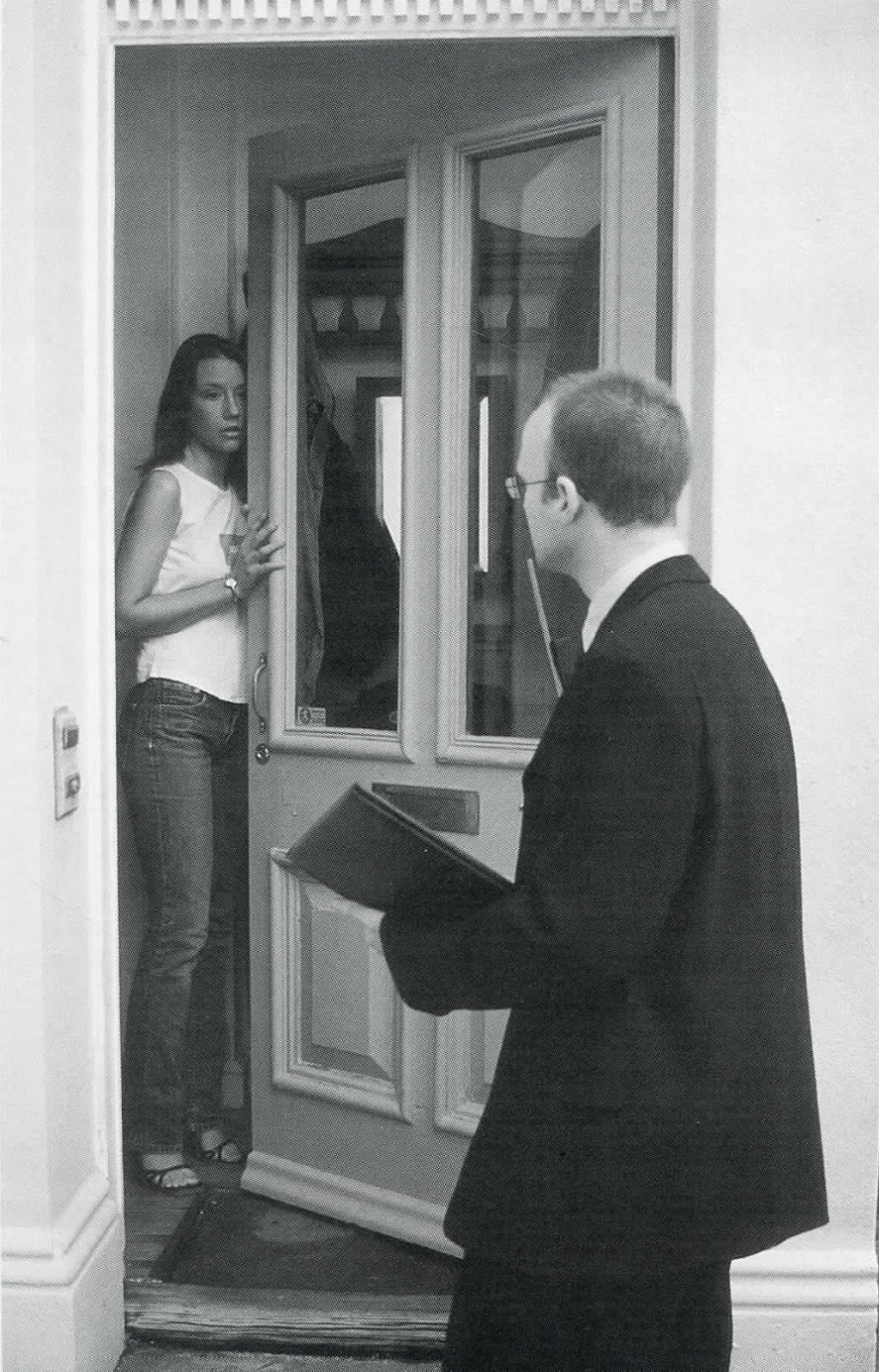 He knocks on the door; she opens it. He shows her the card bearing both their signatures, stating that he will call at this time and place, and she acknowledges it by stepping back and inviting him to enter. He declines her offers of refreshment or a seat and addresses the matter to hand immediately.