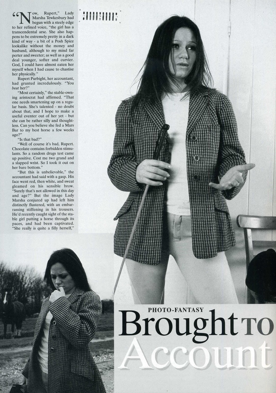 It's a shame that Janus's print run came to an end when it did. Until the end, Janus connected the traditional ethos of the spanking magazine with a very current look for its models de jour. When divested of riding gear and stripped down to her close fitting white tee shirt, Helen Daniels looks a very modern miss, even by today's standards, several years on. The common or garden type of hottie one might see when out and about, and fantasise about spanking. Lovely and tight-bodied, as Mr Evans observes.
