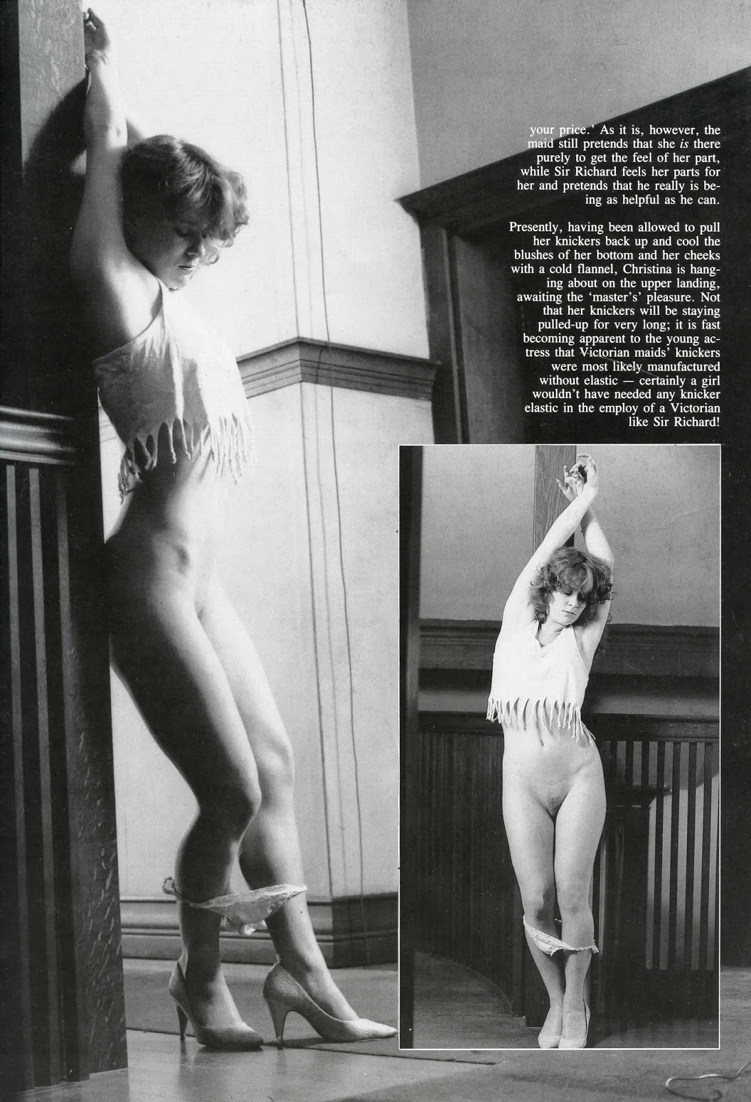 Presently, having been allowed to pull her knickers back up and cool the blushes of her bottom and her cheeks with a cold flannel, Christina is hanging about on the upper landing, awaiting the ‘master’s’ pleasure. Not that her knickers will be staying pulled-up for very long; it is fast becoming apparent to the young actress that Victorian maids’ knickers were most likely manufactured without elastic — certainly a girl wouldn’t have needed any knicker elastic in the employ of a Victorian like Sir Richard!