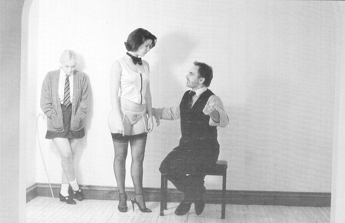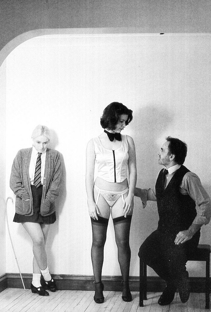 They were in Mr Anfield’s large sitting room. Angela had come in her school uniform which Mr Anfield had said she must wear. Sonia had on a sexy outfit of tight skirt and a fitting white sleeveless top set off by a silk bow tie, together with high heels and dark stockings.