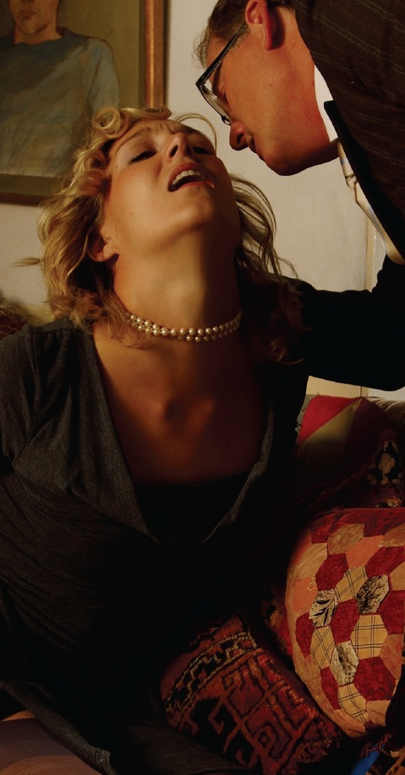Her high heels (the most expensive she has ever owned) have been kicked off, pins are flying from the hairstyle that not so long ago was casual chic and now is more shabby and cheap. Her panties are rolled down to her thighs.