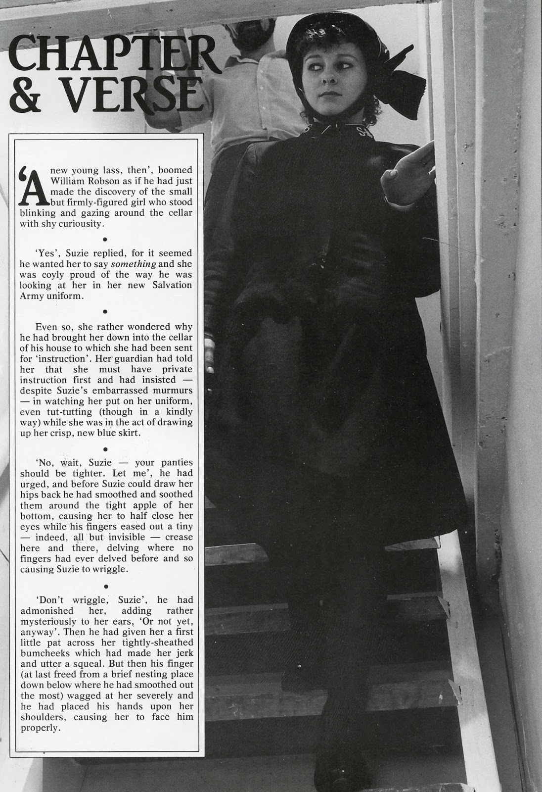 ‘My niece is in the Salvation Army, too, Suzie. Just a year older than I believe you are. She had to start at the bottom, too. It’s quieter down here in the cellar. I am told you are a quiet girl, Suzie — a quiet and obedient girl. I do hope so. Are you? Are you?’ he repeated, bringing the end of the cane under her chin — just the tip of it — so that she had to hold her head up just as she had a short while before in the bedroom.