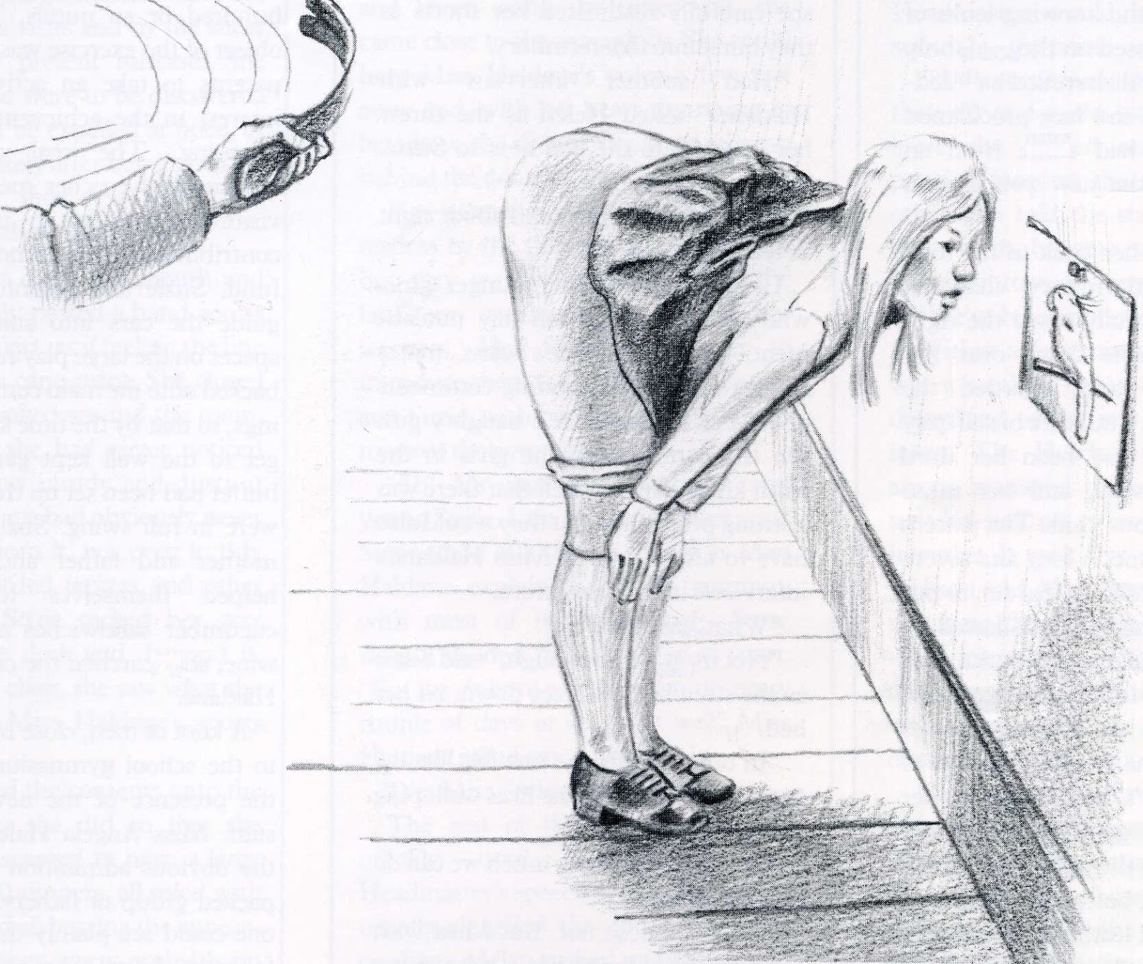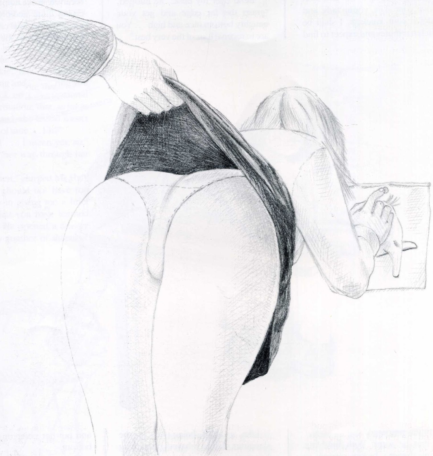 ‘Not up there!’ he boomed, ‘lower… lower still… that’s it,’ his directions to the girl meaning that ‘Polly’ was on display no more than three feet from the floor. ‘Now,’ the teacher chimed, ‘stay right where you are… No, don’t get up — stay there!’ He then went to his desk and took out his two-tailed tawse. A low murmuring went around the room as he approached the bent over Brenda.