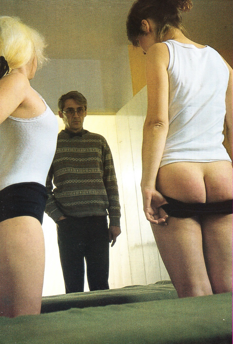 Mr Canford is in fact watching. From the wall opposite the window where the small mirror is in reality a one-way viewing panel. On the other side is one of those secret rooms which Mr Canford’s house contains, this one more of a passageway really. But with space enough for Andrew Canford to stand and watch. The two girls on the bed. Mandy on her back, her knickers now off, struggling weakly. Pam kneeling on the bed to the side and bending over her. Her hand in the blonde girl’s crotch. At her cunt. Two fingers in her cunt and making drooling sounds. Working at the new girl’s clit. Working her up.