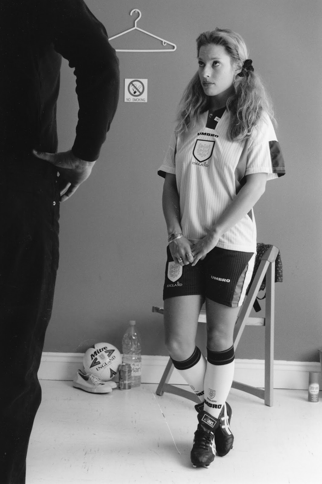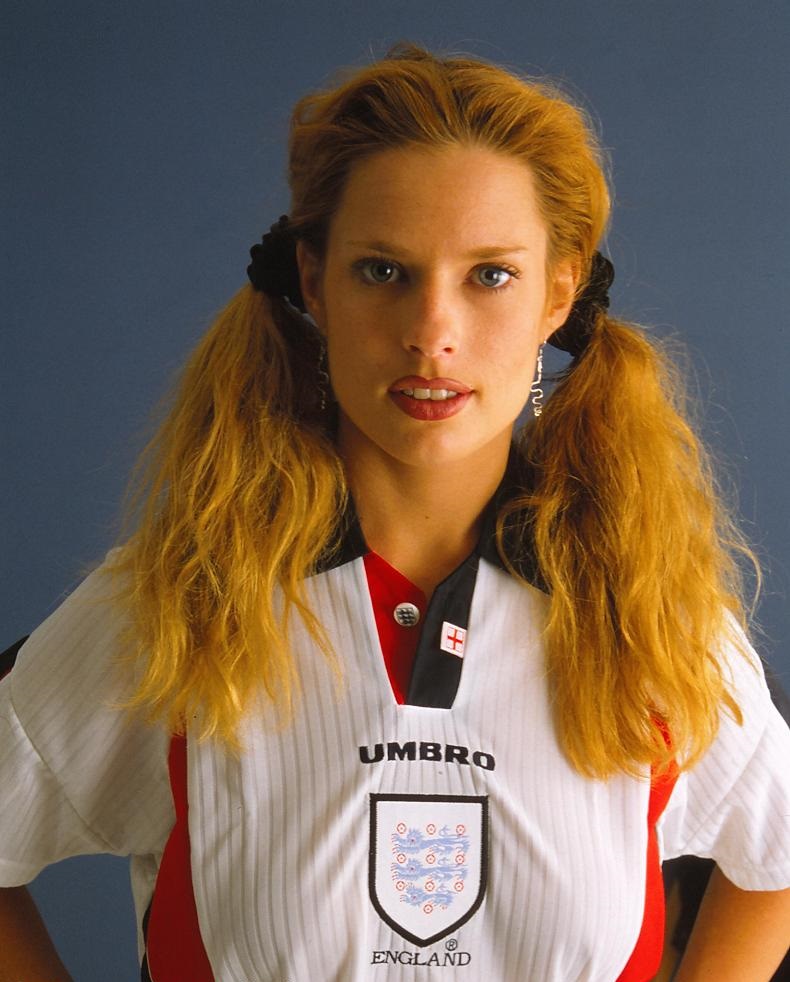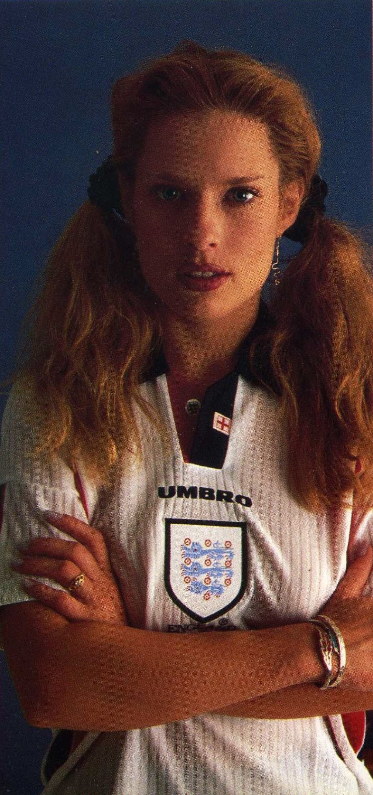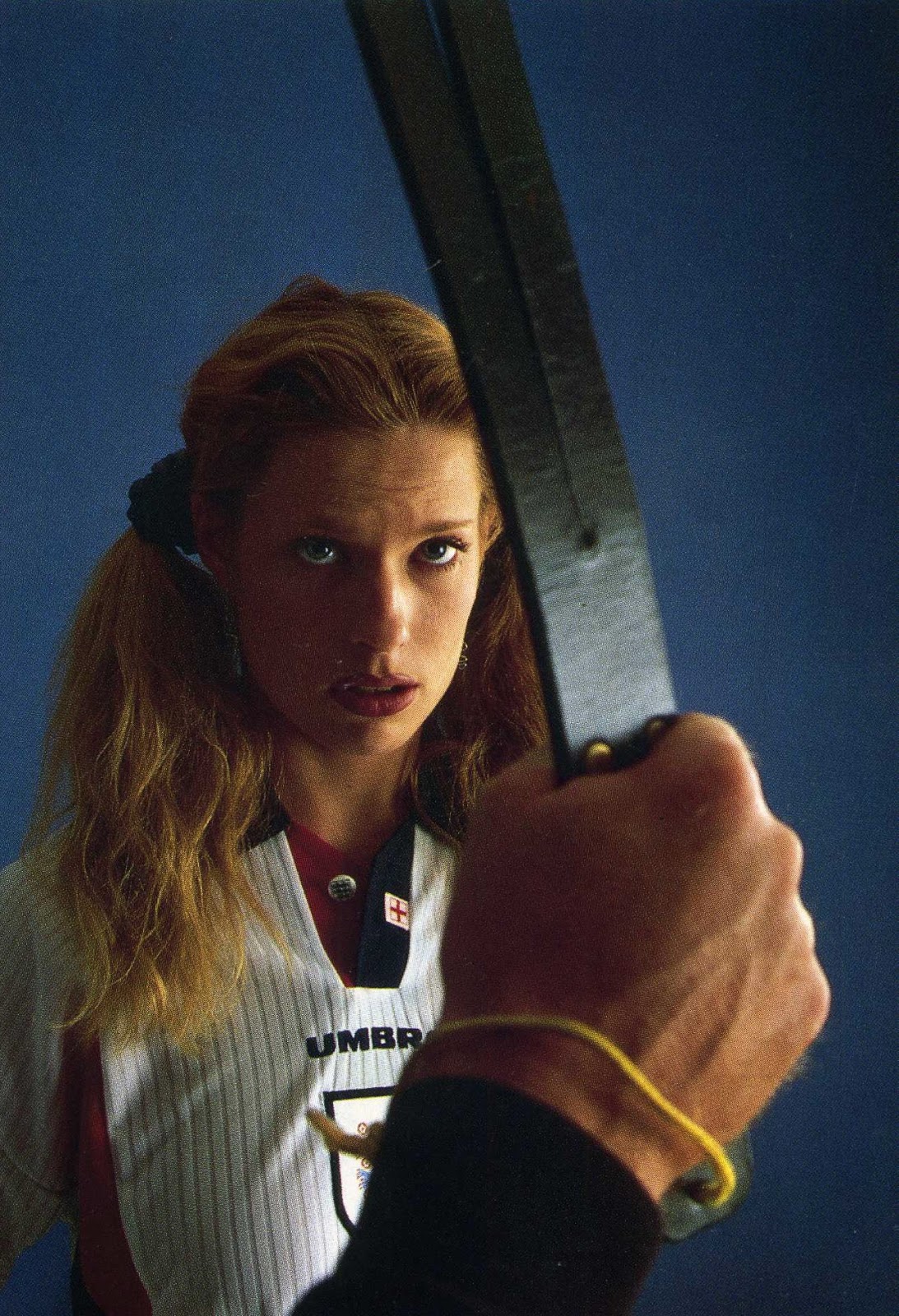 From Janus 125. I am guessing this feature dates from 1998 as the model is in an England strip and being managed by "Glyn Haddle". The writer of this brief text seems to have taken on the challenge of cramming as many puns and double-entendres in as they possibly could.