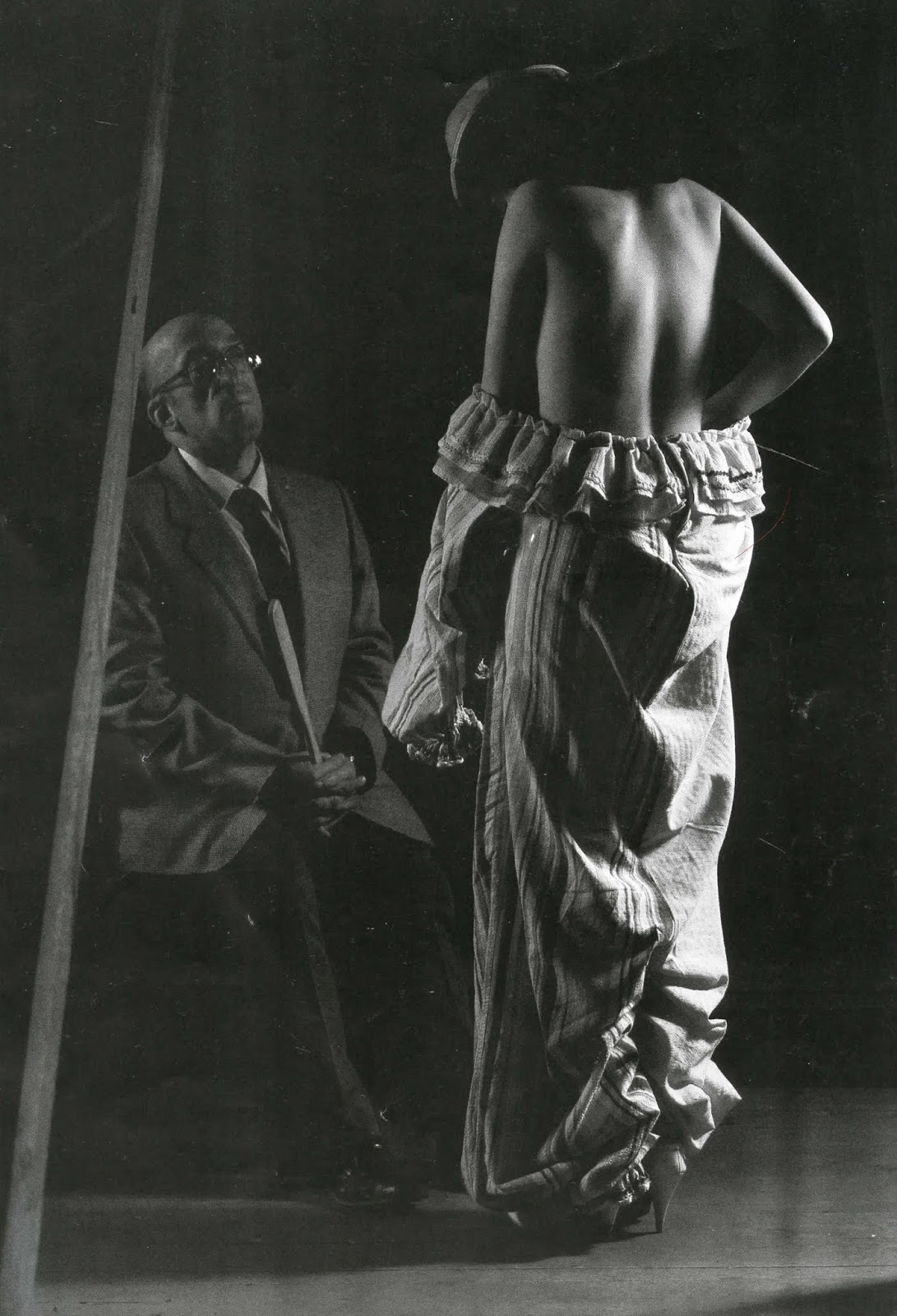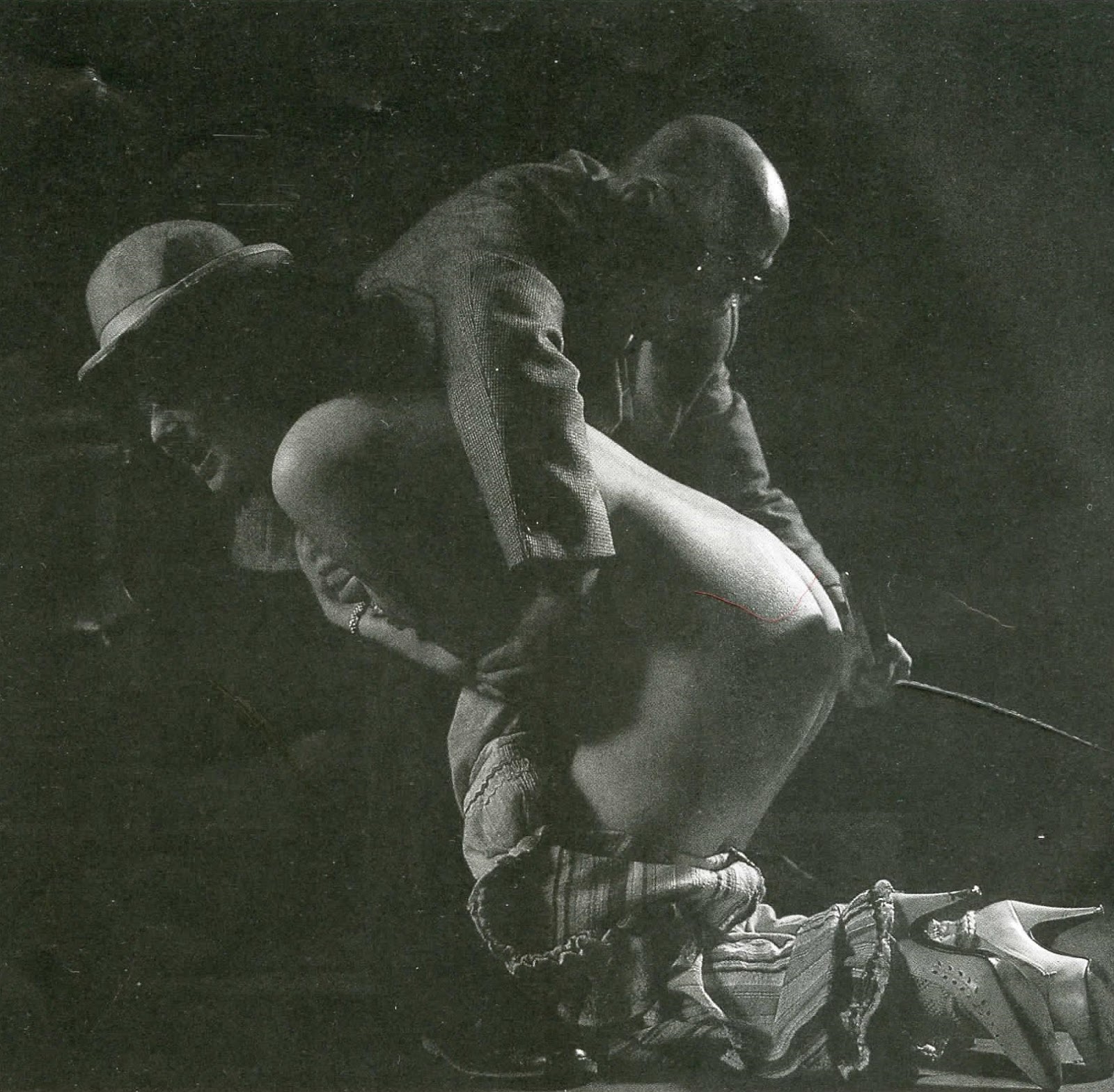 She knelt, with the clown’s dress round her thighs. Upright but then Major Lambton made her bend down, hands on the floor. He was on his feet, round behind her. His hand all at once at her bare bottom. Slapping it; then groping.