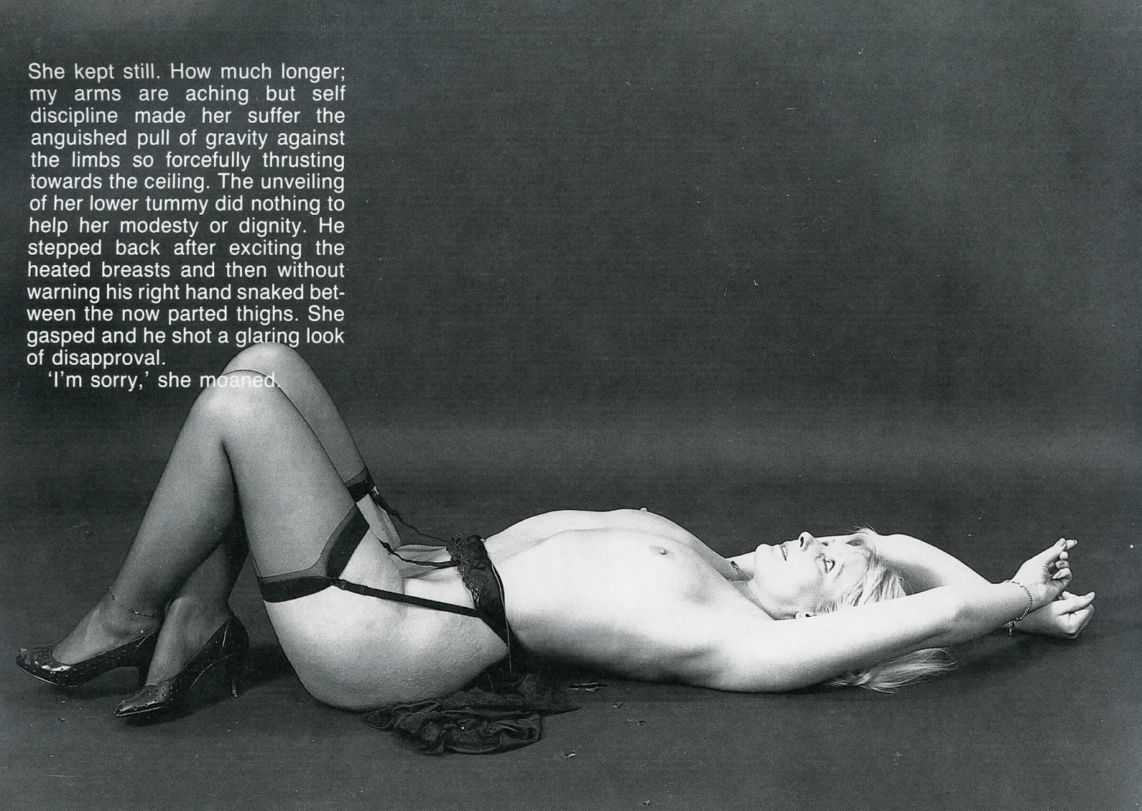 Laying like that, she slowly pulled her hands round to her rear. She had now been enforcedly forbidden to touch her own bottom and the need to just lay her cool fingers on the bare flanks of her arse was a highly desirable action. She did not touch her bottom despite that urge to do so. This exposure of her tummy was once again enhanced as she cringed inwardly, but only inwardly from his rudely inspecting eyes. She had never felt so utterly open and his eyes revealed nothing to her; whether he found her desirable or whether her naked body caused him pleasure, just nothing.