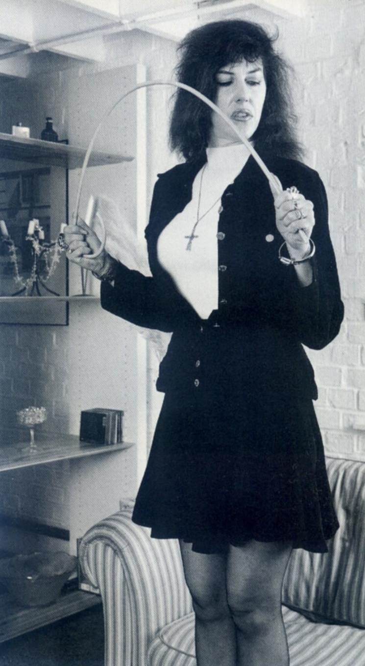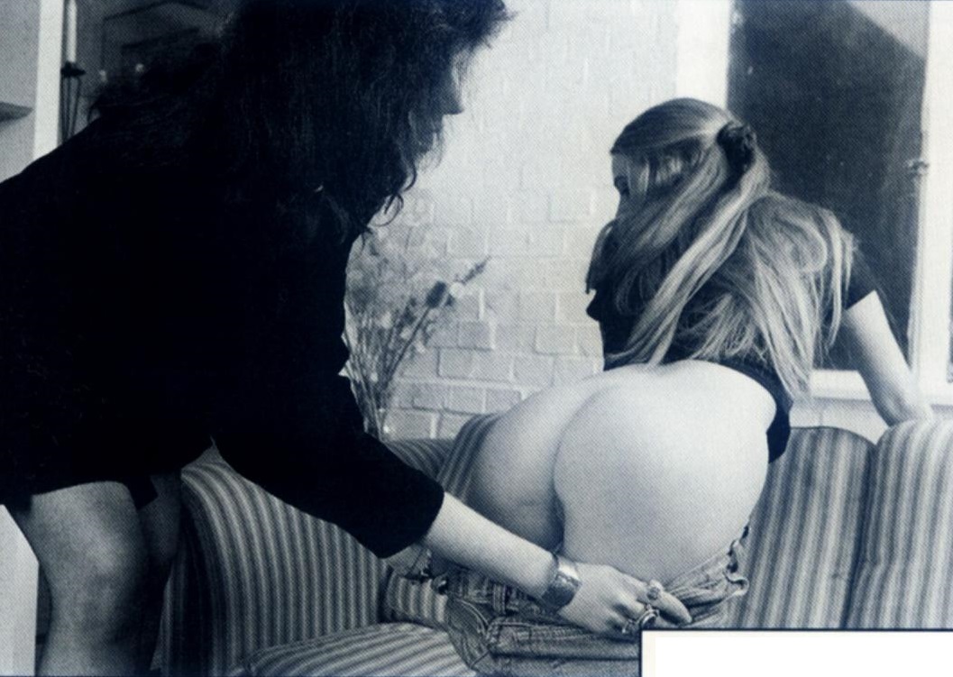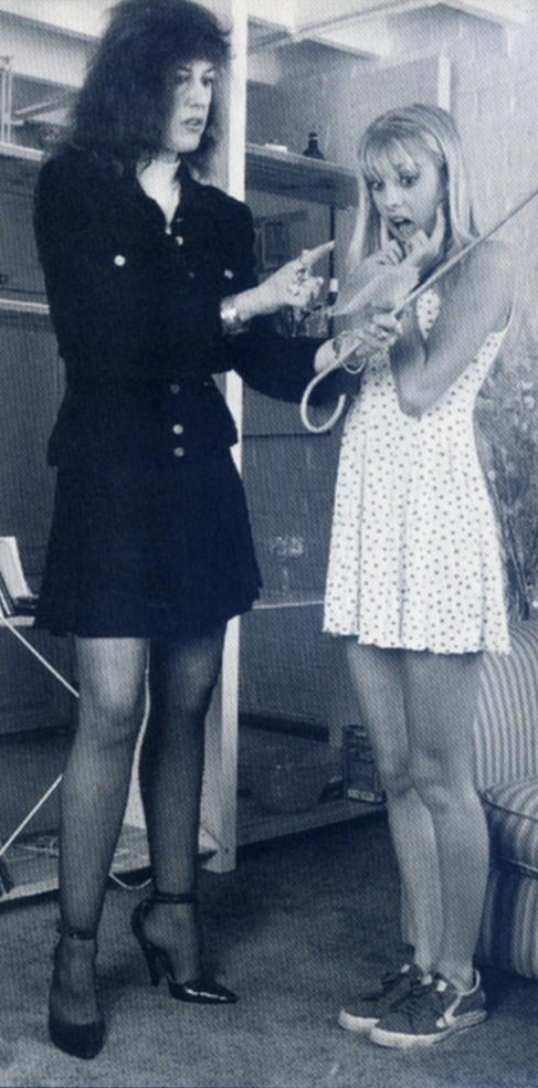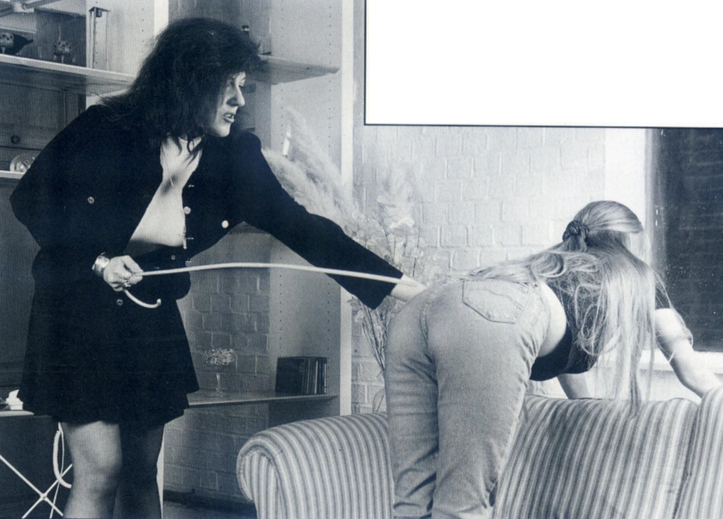 Maureen was the first to regain her powers of speech and decided to call their bluff. ‘Yes, I think that would be sensible. A good old-fashioned leathering to instil some good old-fashioned values into your wanton souls.’ Somewhat to her surprise, she met no resistance, so she continued. ‘Right, Toni, you go and wait in the bedroom, while I see to your friend here.’ She turned to watch the blonde leave and something on the bookcase caught her eye.