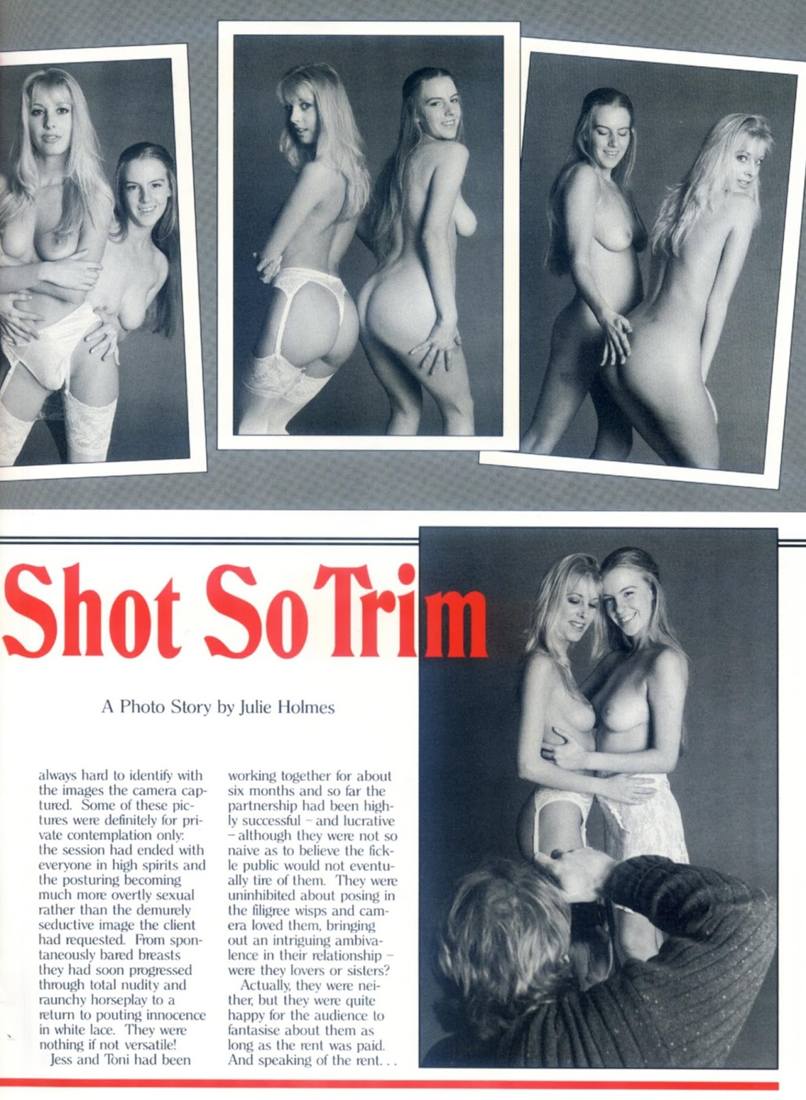 Jess and Toni had been working together for about six months and so far the partnership had been highly successful — and lucrative — although they were not so naive as to believe the fickle public would not eventually tire of them. They were uninhibited about posing in the filigree wisps and the camera loved them, bringing out an intriguing ambivalence in their relationship — were they lovers or sisters?