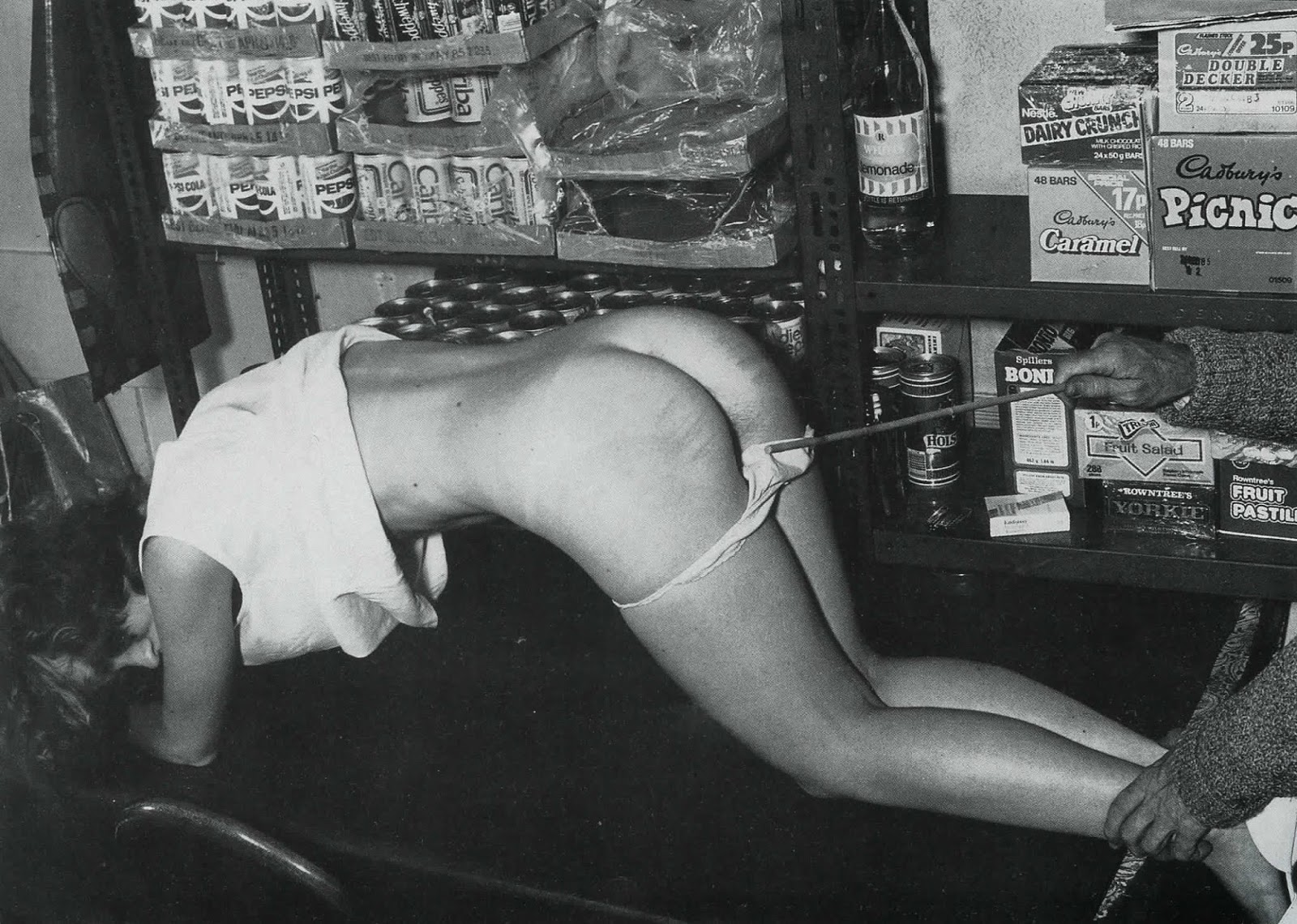 ‘Nice eh? A nice little package.’ Mr Bartling’s large hand slaps his employee’s tightly-knickered bottom, producing a sharp squeal of alarm. Perhaps it is this response which inspires Mr Bartling to wish to provide a further demonstration of Sarah’s charms, or perhaps he intended it in any case. At any rate he takes her arm, at the same time sitting heavily down on the battered kitchen chair which stands to one side and is used by Sarah and Maureen when reaching for the upper shelves. In a no doubt practised movement he pulls Sarah down and over his lap. Another sharp cry, louder this time. An automatic response, though, and not emitted with any particular hope of preventing Mr Bartling from what he clearly now intends to do. For he is yanking down the tight white knickers. Pulling them right off of the ripe, round cheeks, the soft, pale globes of Sarah’s bottom. An arousing sight all right and Raymond Pinkford is correspondingly and immediately aroused, his face hot and the front of his trousers suddenly undeniably tight. His manhood is stiff, purple-headed, thrusting, or eager to thrust, to get into action. The action which is now Mr Bartling cracking his large hand heavily down on these soft, sweet cheeks.