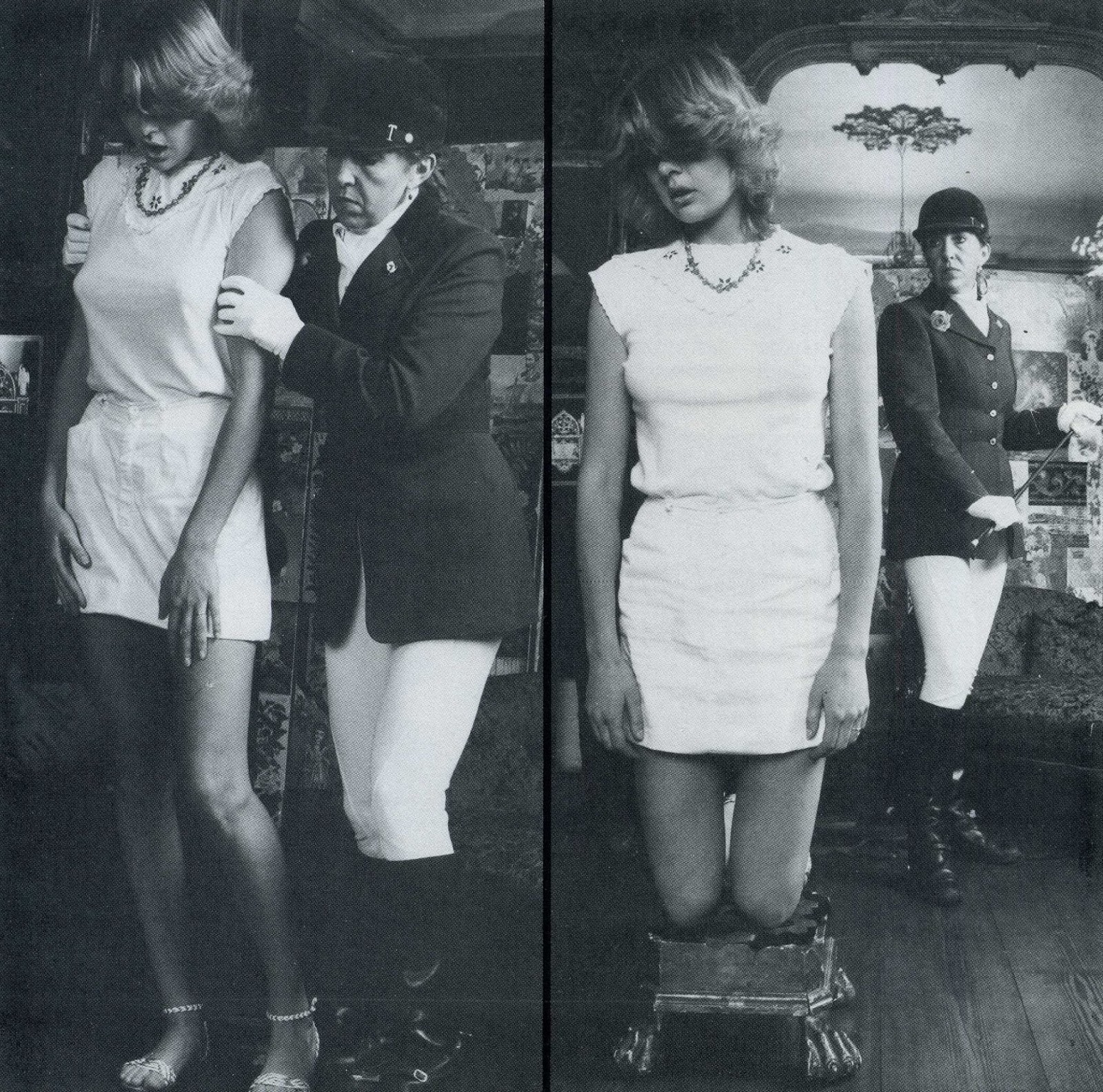 What followed is shown, in complete detail, in these sequential photographs. Before Deborah could take stock of what was happening to her, she found herself being grasped by her upper arms and forced by the strong and determined woman towards a small, low, square footstool, and made to kneel on it.