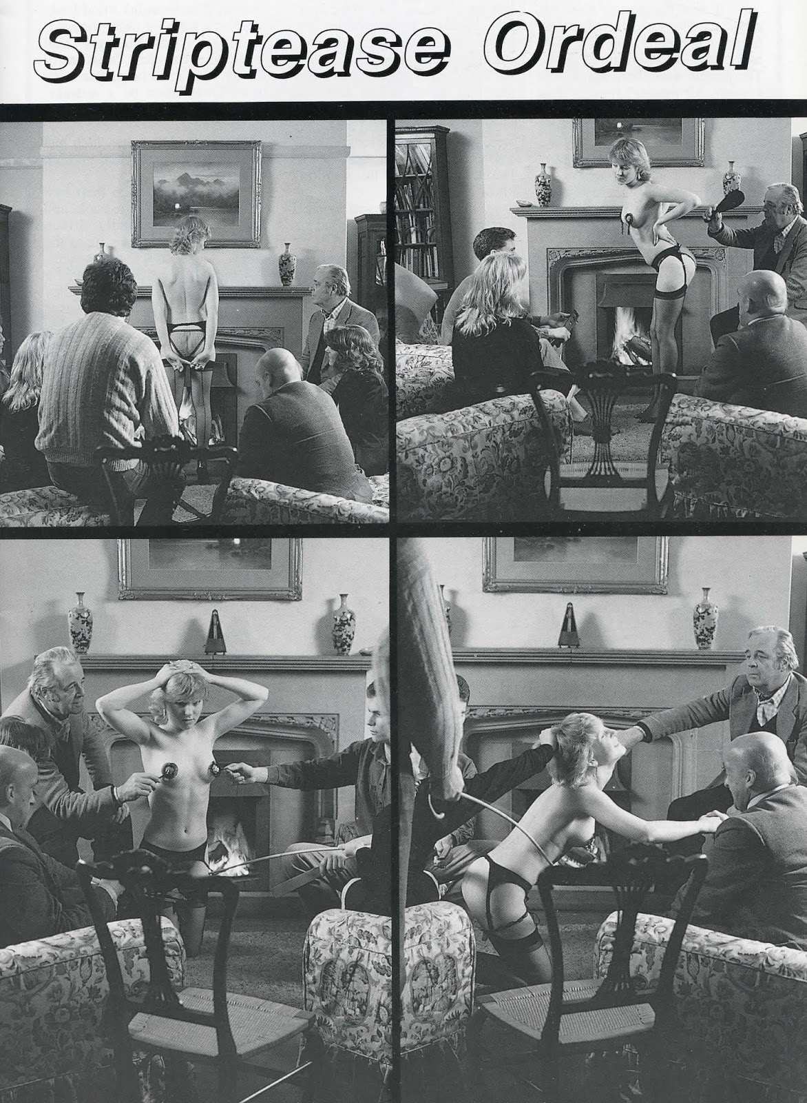 And now on her hands and knees. The faces around her looking more excited. Crazed almost. Men’s hands reach to pull off the tassels, and pinch her nude nipples. A woman’s hand sharply pulling her hair. She has to cross her arms behind her back. Other hands maul her…